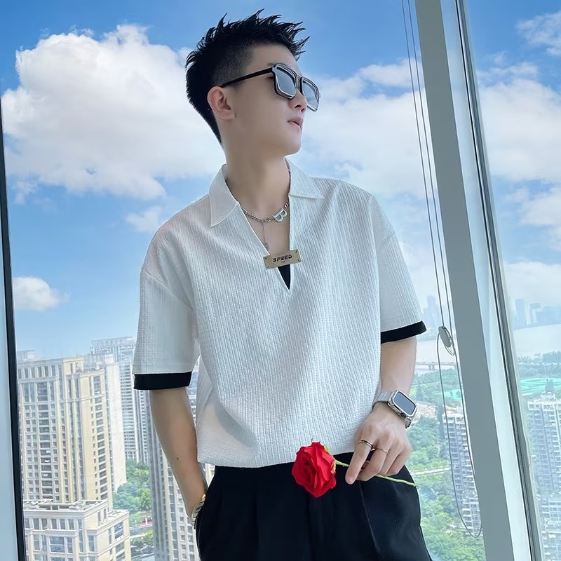 Kemeja Polo Lengan Pendek Pria Model Baru Musim Panas Pakaian Pria Kerah Tegak Modis Ramping Versi Korea Trendi Pemuda Setengah Bbaya Atasan Grosir