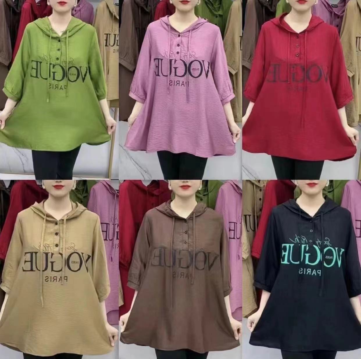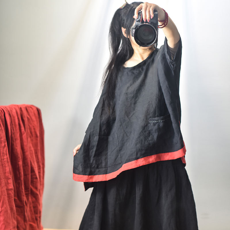 Kaus katun linen asli wanita, atasan perjalanan kasual super longgar ukuran besar dengan warna yang cocok musim panas/asli