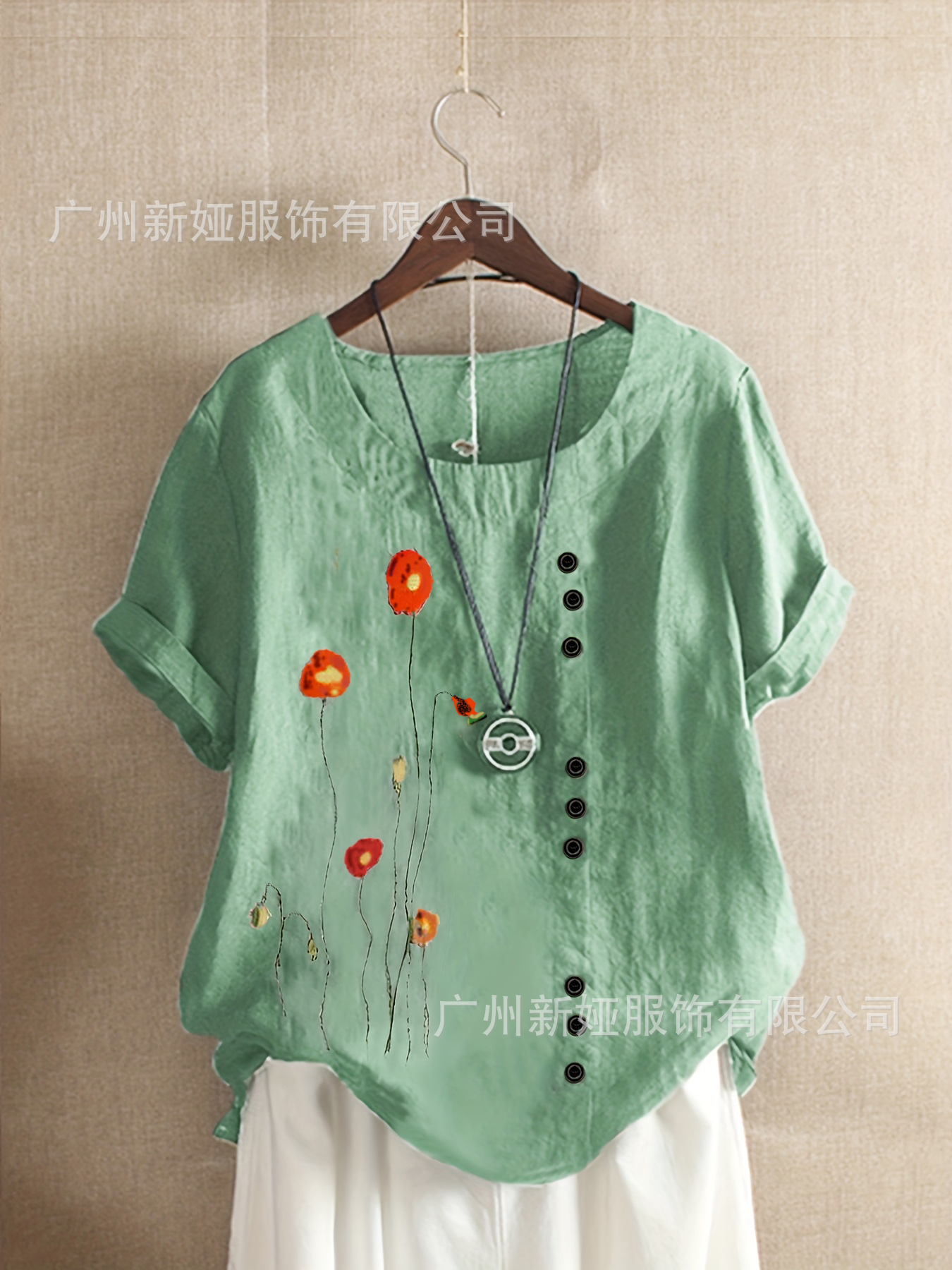 Retro musim panas 2021 pakaian wanita pullover, Kaus katun dan linen kasual longgar lengan pendek bermotif, ukuran besar