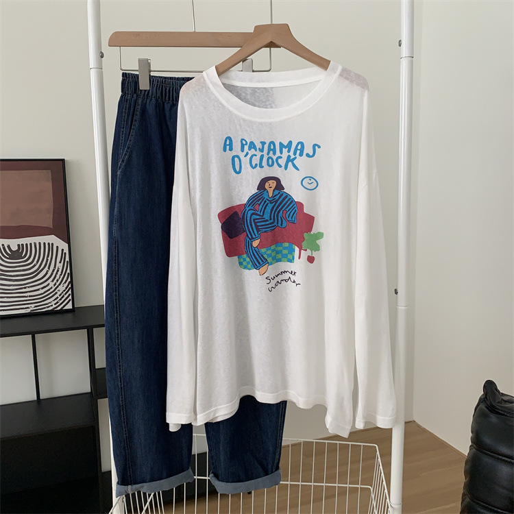 Kaos lengan panjang tipis pelindung matahari untuk wanita, model baru musim panas 2025, motif kartun, longgar dan serbaguna, ukuran besar, atasan blus wanita
