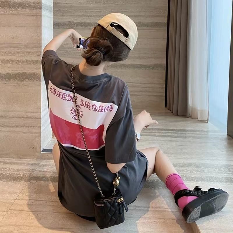 Kaus lengan pendek abu-abu katun murni wanita 100% Atasan musim panas baru longgar setengah panjang tubuh bawah hilang versi besar modis