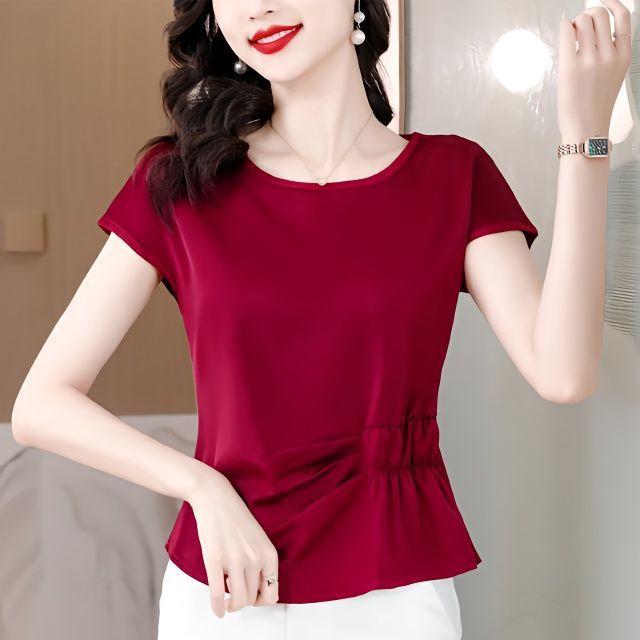 Kaus lengan pendek, kaus sutra es 2024 baru elegan kecil gaya Barat pelangsing serbaguna ukuran besar musim panas
