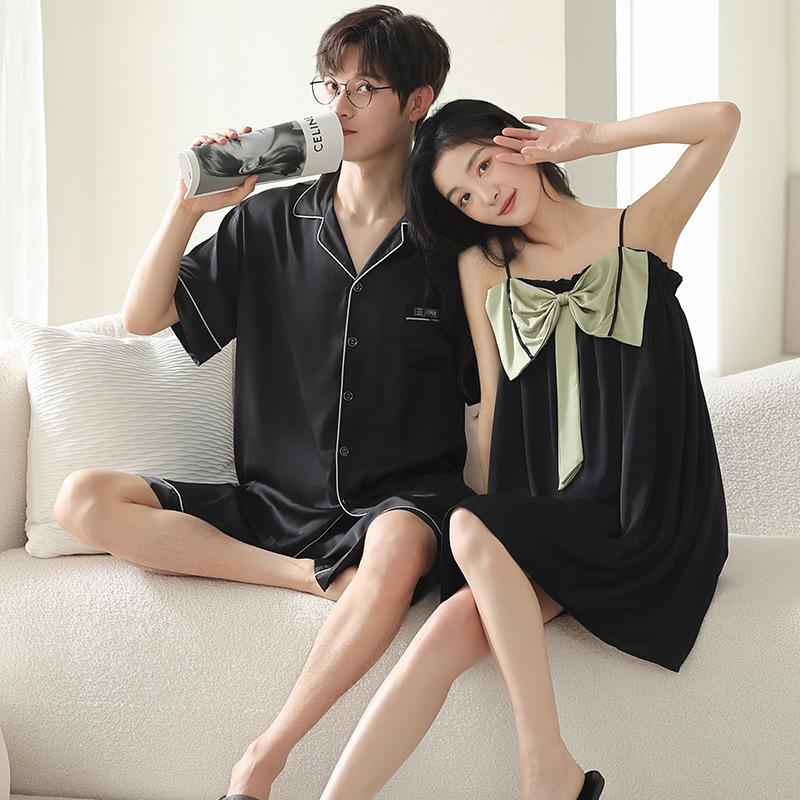 Piyama pasangan musim panas wanita, baju tidur tali sutra es gaya keinginan murni musim panas lengan pendek longgar