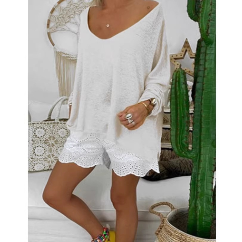 Kaus lengan pendek Off-shoulder, atasan kaus kerja berat renda berlubang lengan pendek baru musim panas 2024, longgar ukuran besar