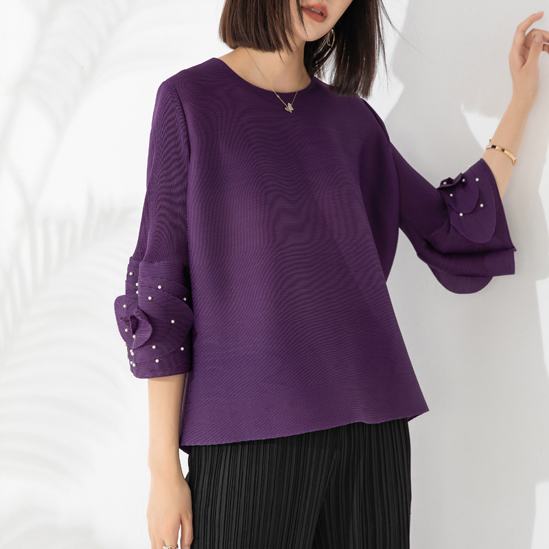 Kaus leher bulat warna polos berlipat wanita mode baru musim gugur atasan pullover manik-manik bunga pelat ukuran plus longgar Semua cocok