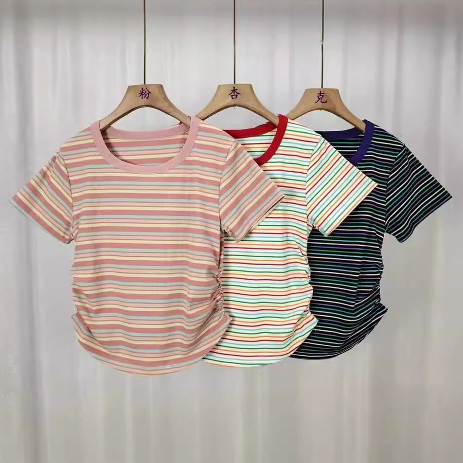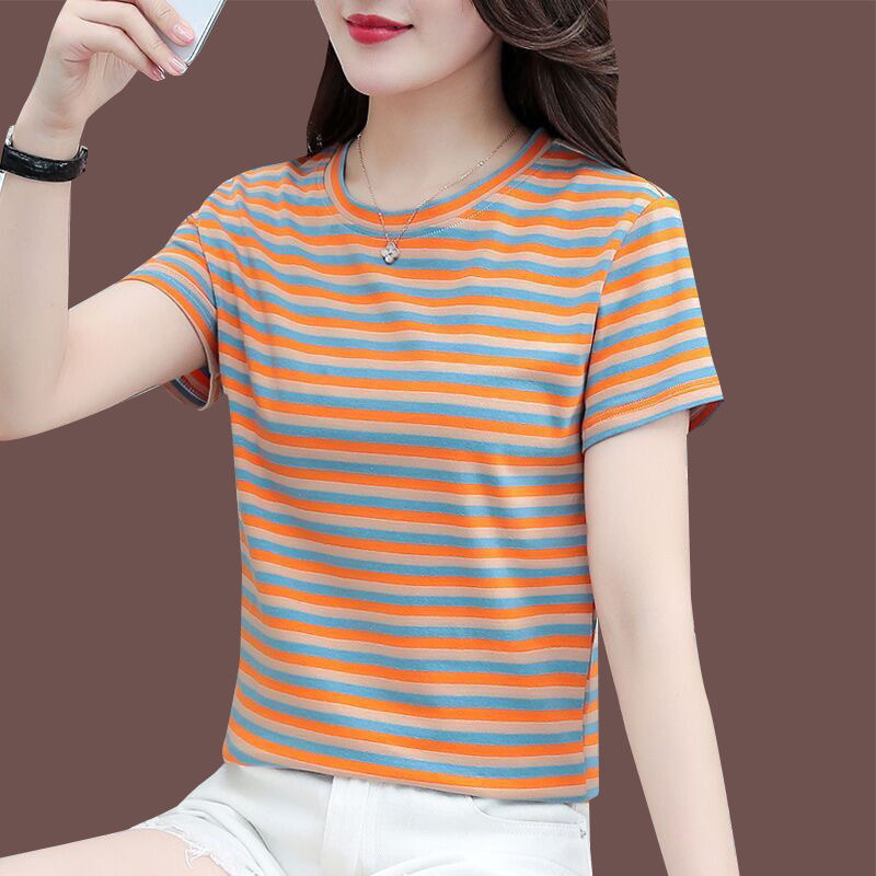 Kaus lengan pendek bergaris untuk wanita, atasan setengah lengan pelajar ukuran plus leher bulat ramping longgar gaya Korea musim panas untuk murid perempuan