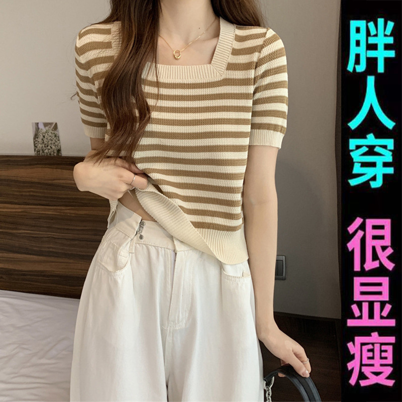 Ukuran besar kaus rajut bergaris pelangsing penutup perut lebar musim panas 2023 atasan kerah persegi lengan pendek kaus rajut Wanita lemak 220kg