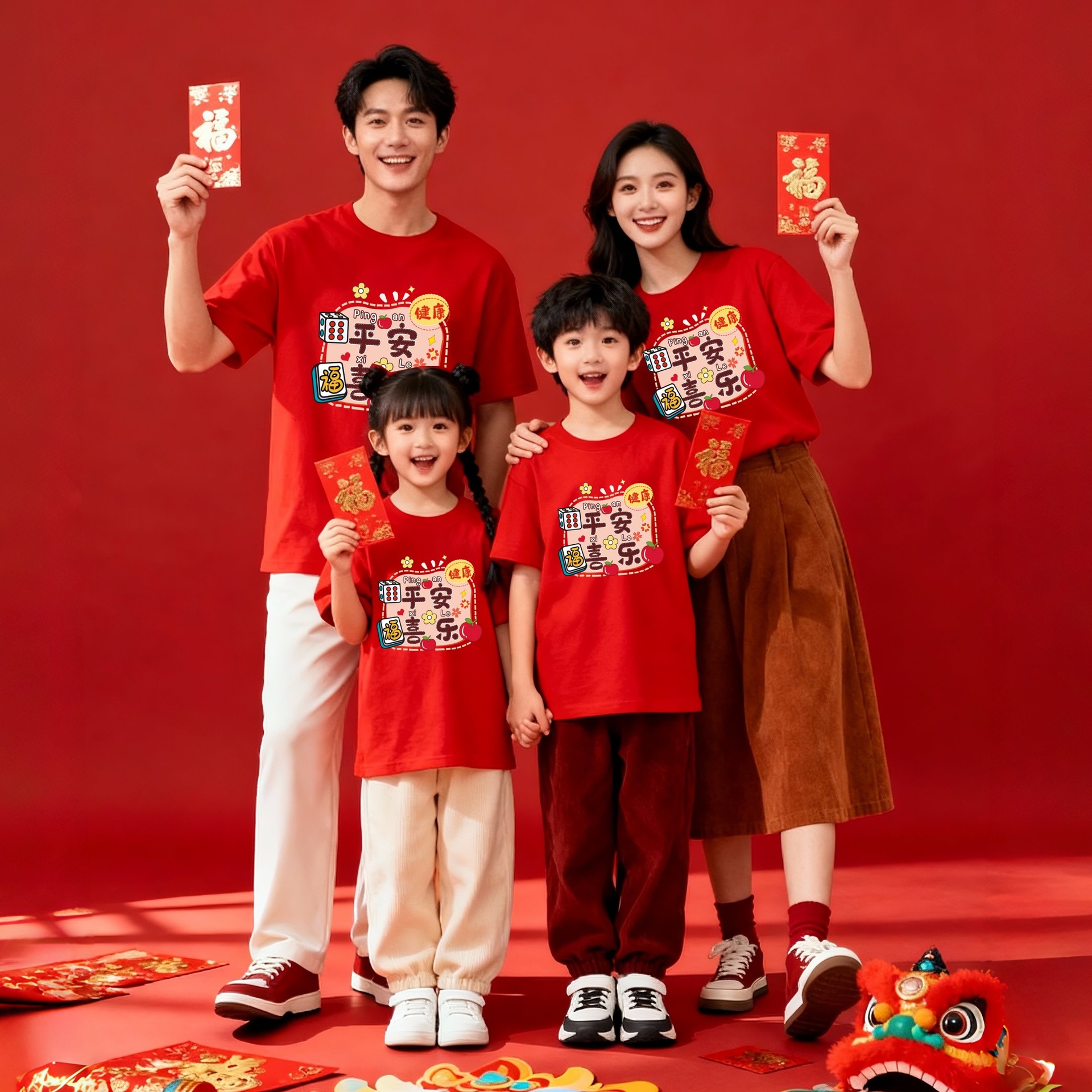新年事事顺心亲子装短袖一家三口四口过年红色喜庆聚会母女装t恤