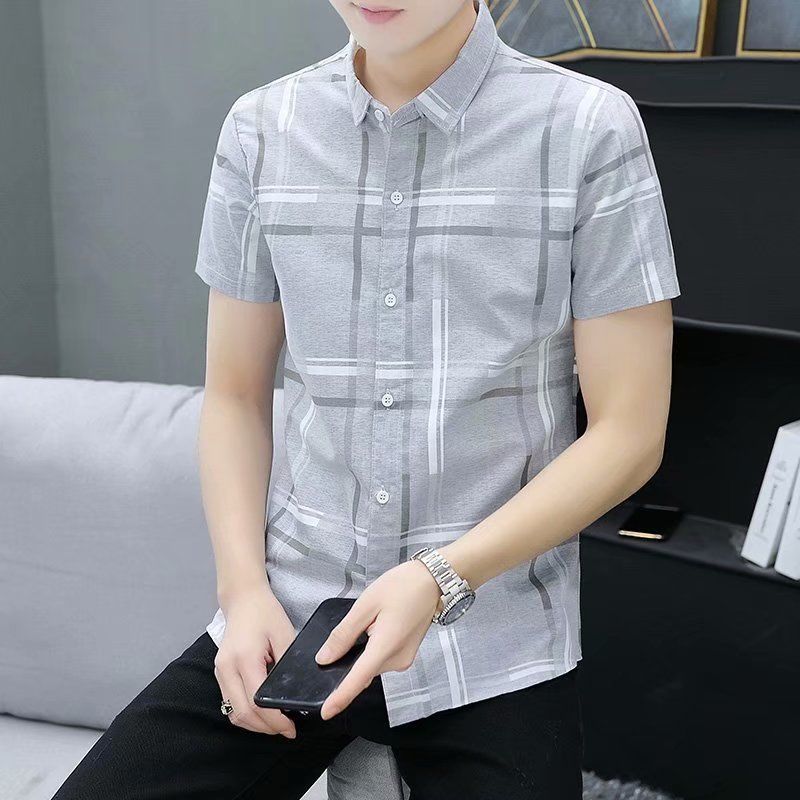 Kemeja lengan pendek pria, musim panas gaya Korea slim-fit trendi kemeja pria tampan bergaris kasual bisnis kemeja setengah lengan