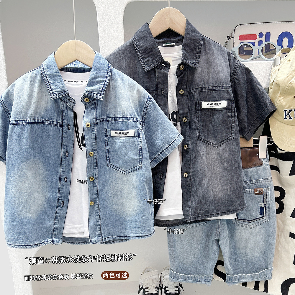 Kemeja Denim Anak Laki-laki Lengan Pendek Musim Panas Atasan Musim Panas Gaya Barat Warna Gradien Anak Sedang Besar Model Baru 2025 Kemeja Lengan Setengah