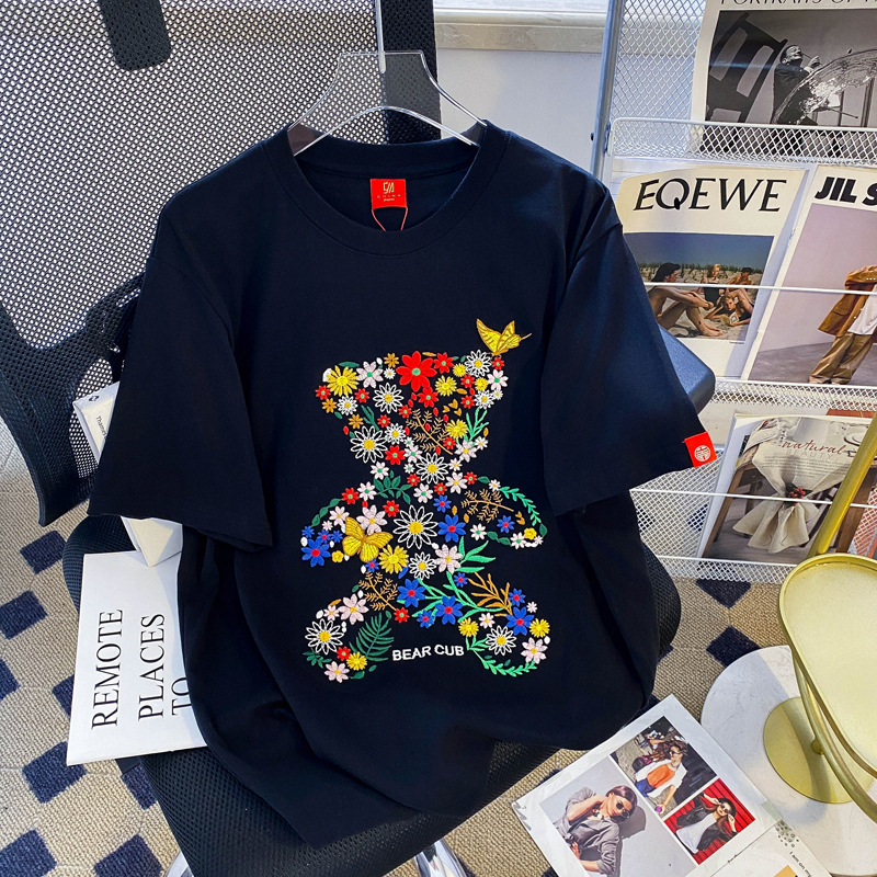 Kaus lengan pendek wanita, baju bahu wanita lengan pendek bordir beruang pekerjaan berat gaya Korea longgar musim panas 2024