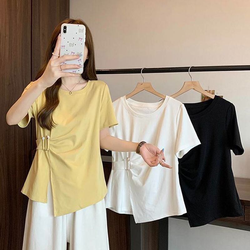 T-shirt Lengan Pendek Menutupi Daging Terlihat Langsing Bahu Perut Tidak Beraturan Model Baru Musim Panas Wanita Berukuran Besar Katun Tulen Wanita Atasan