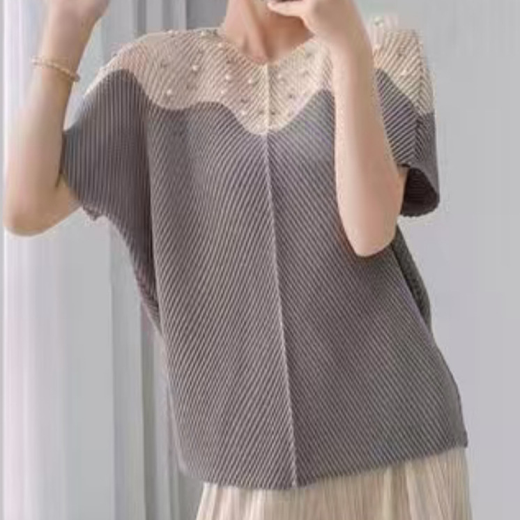 Sanzhai atasan lipit wanita lengan pendek, kaus motif pelangsing leher bulat ukuran plus longgar berlipat 2023 musim panas