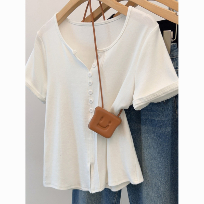 Kaus lengan pendek musim panas wanita desain rasa bahu kecil sedikit lemak pelangsing daging menutupi atasan Prancis pendek manis dan pedas