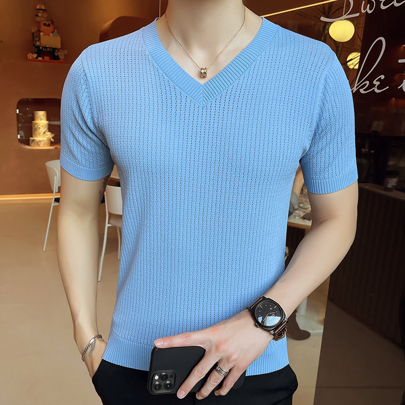 Kaus lengan pendek rajut kerah V pria, baju sweter trendi kerah V tipis bersirkulasi udara ukuran besar lengan setengah, kaus lengan pendek rajut untuk pria