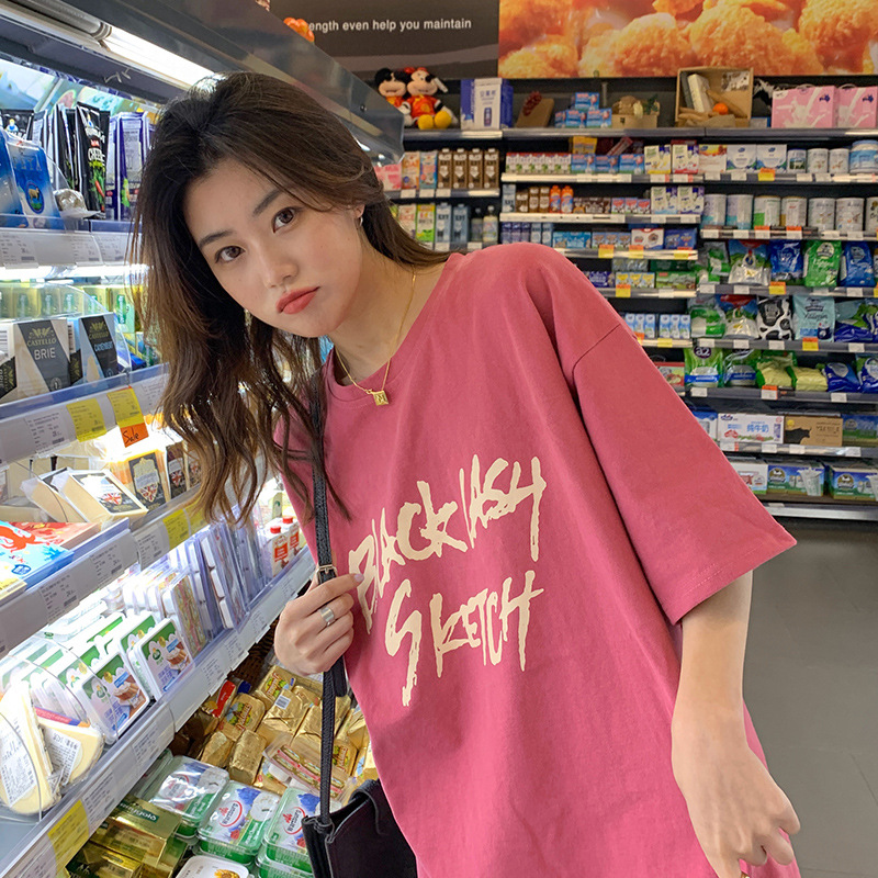 Kaus wanita lengan pendek, atasan perempuan lengan pendek, longgar, ukuran plus, panjang setengah, gaya BF, cetak huruf, gaya Korea, baru, musim panas 2022