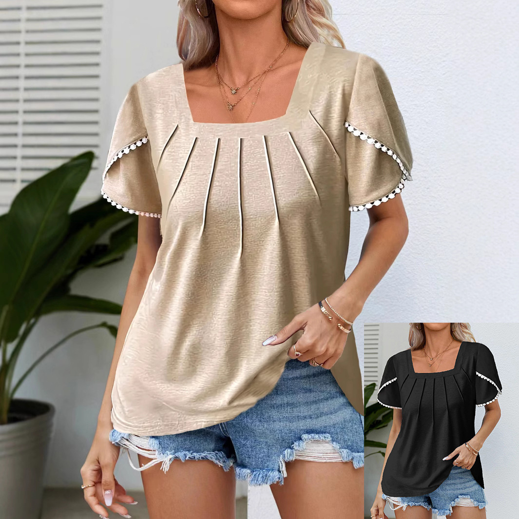 2025 Kaos Kasual Wanita Ukuran Besar Lengan Pendek Berkerah Warna Solid Lipit Warna Solid Cross-Border Amazon Eropa dan Amerika