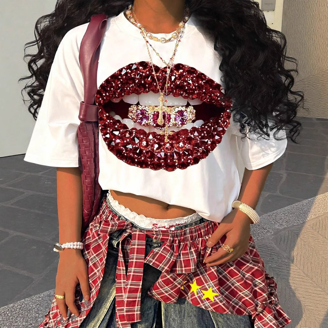 Kaos Wanita Gaya Jalanan Trendi Lengan Pendek Bahu Jatuh Gaya Instagram Ukuran Besar Longgar Motif Perhiasan Bibir Lucu Wanita