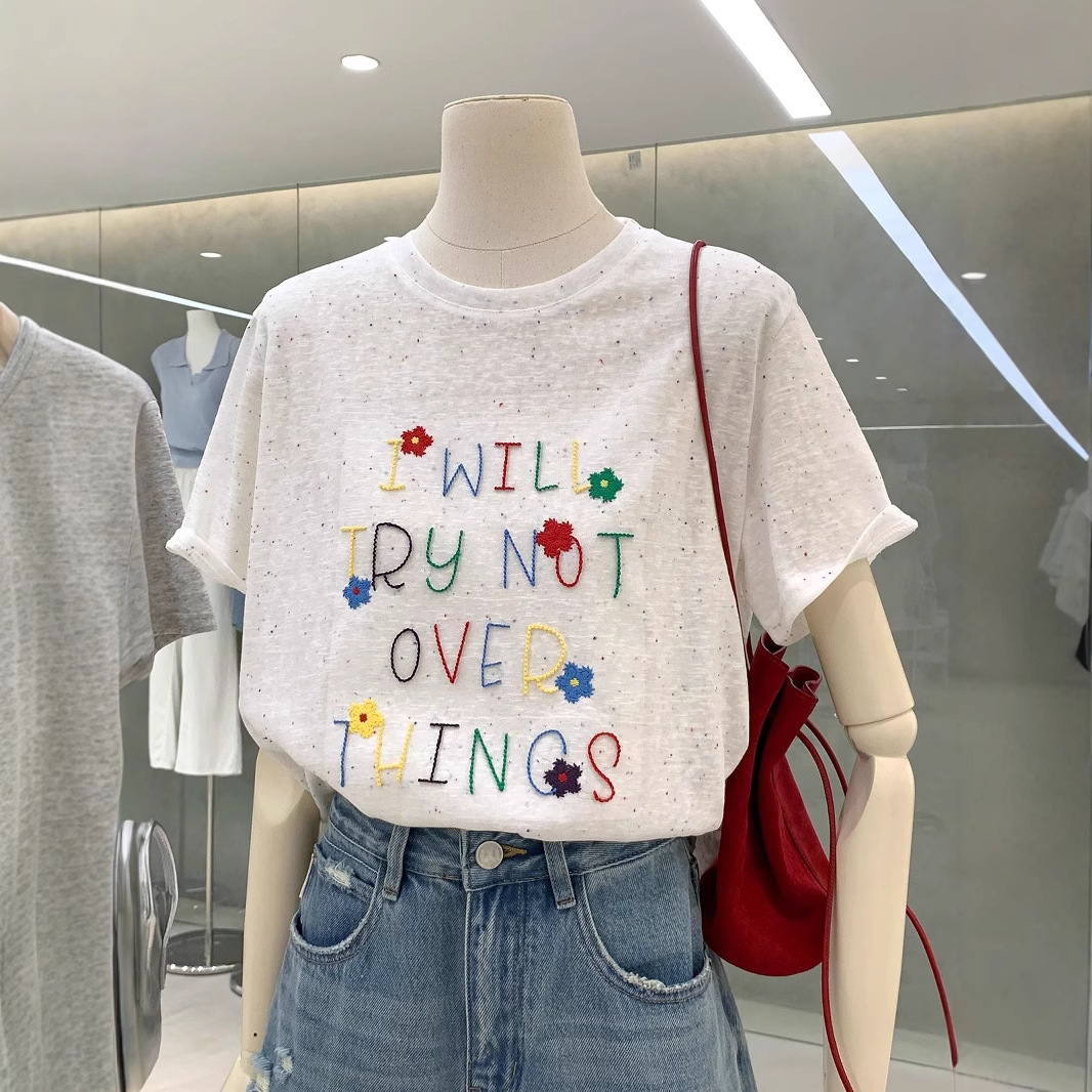 Pakaian Wanita Ukuran Besar Kaus Lengan Pendek Garis Panjang Sedang Longgar Musim Panas Model Baru 2025 Atasan Hati Bordir Gaya Barat Wanita