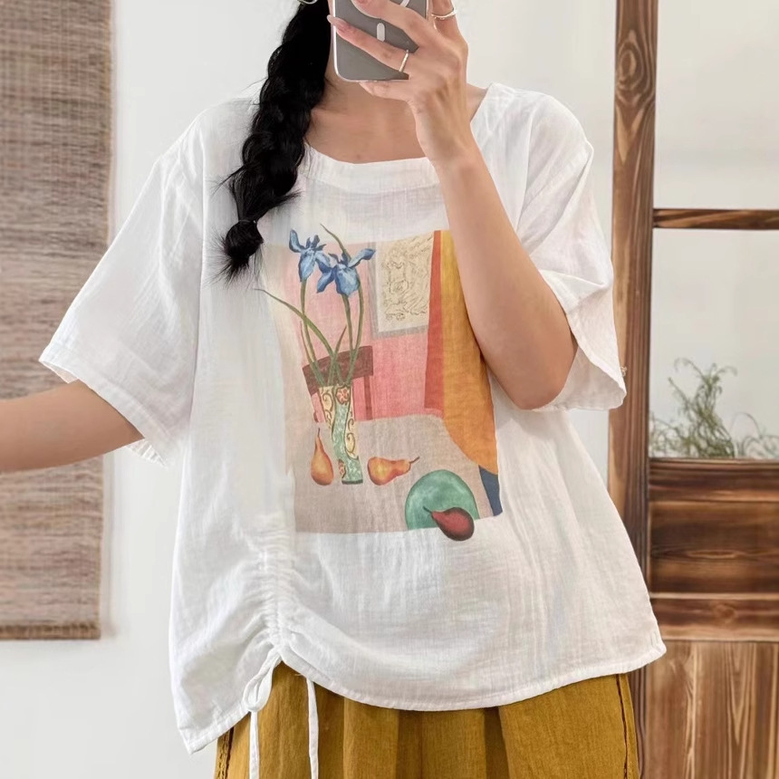 T-shirt Lengan Pendek Motif Cetak Benang Katun Ukuran Besar Longgar Jepang Korea Pakaian Atasan Pabrik Grosir