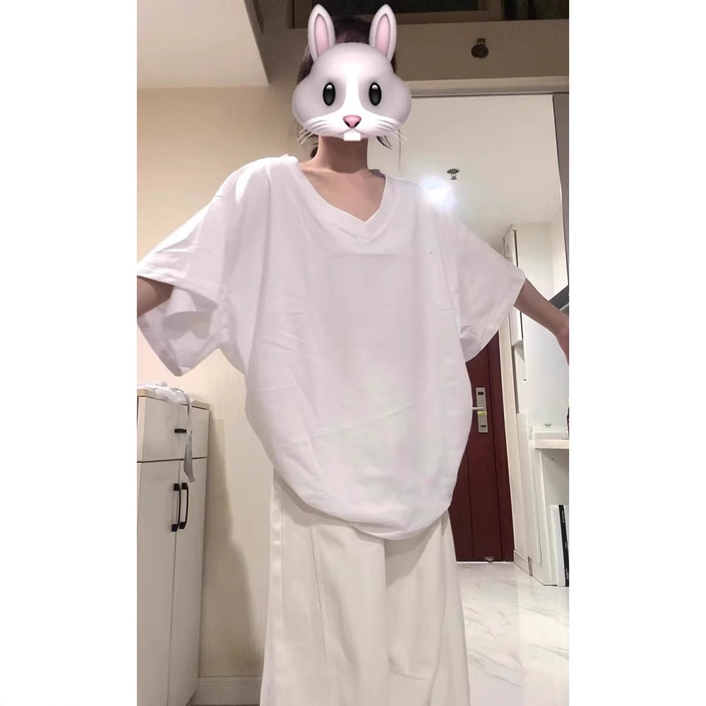 T-shirt Lengan Pendek Katun Murni Kerah V di Bahu Atasan Setengah Lengan Longgar Versi Besar Trendi Versi Korea Musim Panas Wanita T-shirt Kasual Mudah Dipadu Padan Sederhana