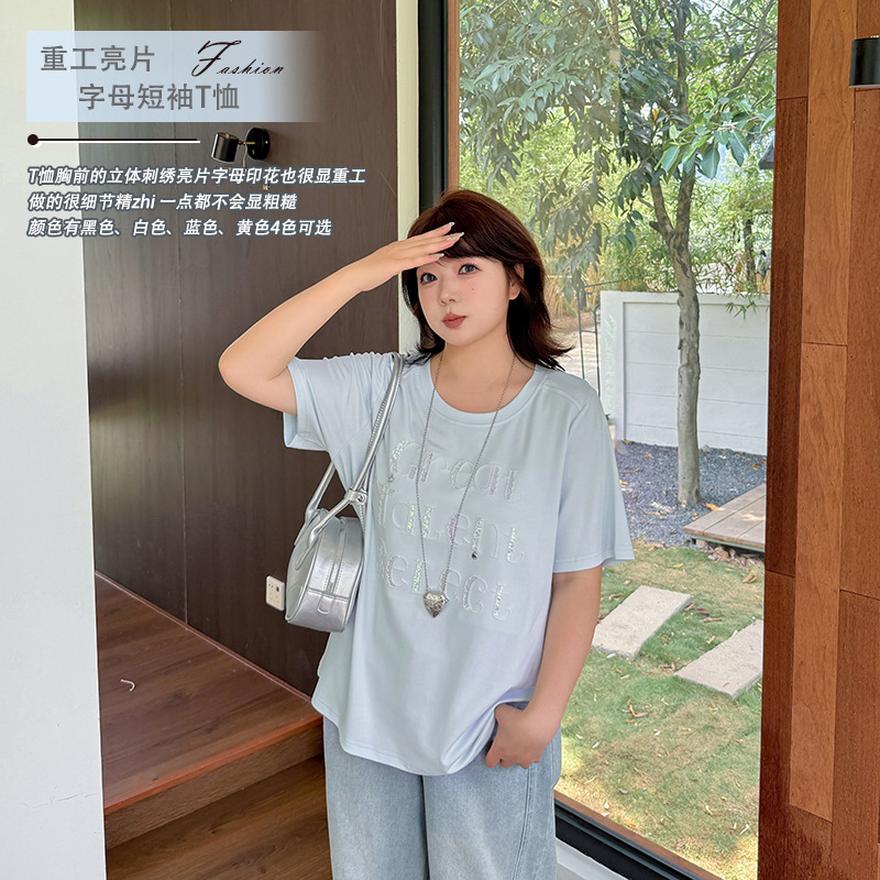 Pakaian Wanita Ukuran Besar Model Baru Musim Panas 25 Tahun Kaus Lengan Pendek Huruf Payet Pekerja Berat Wanita Gemuk 8961