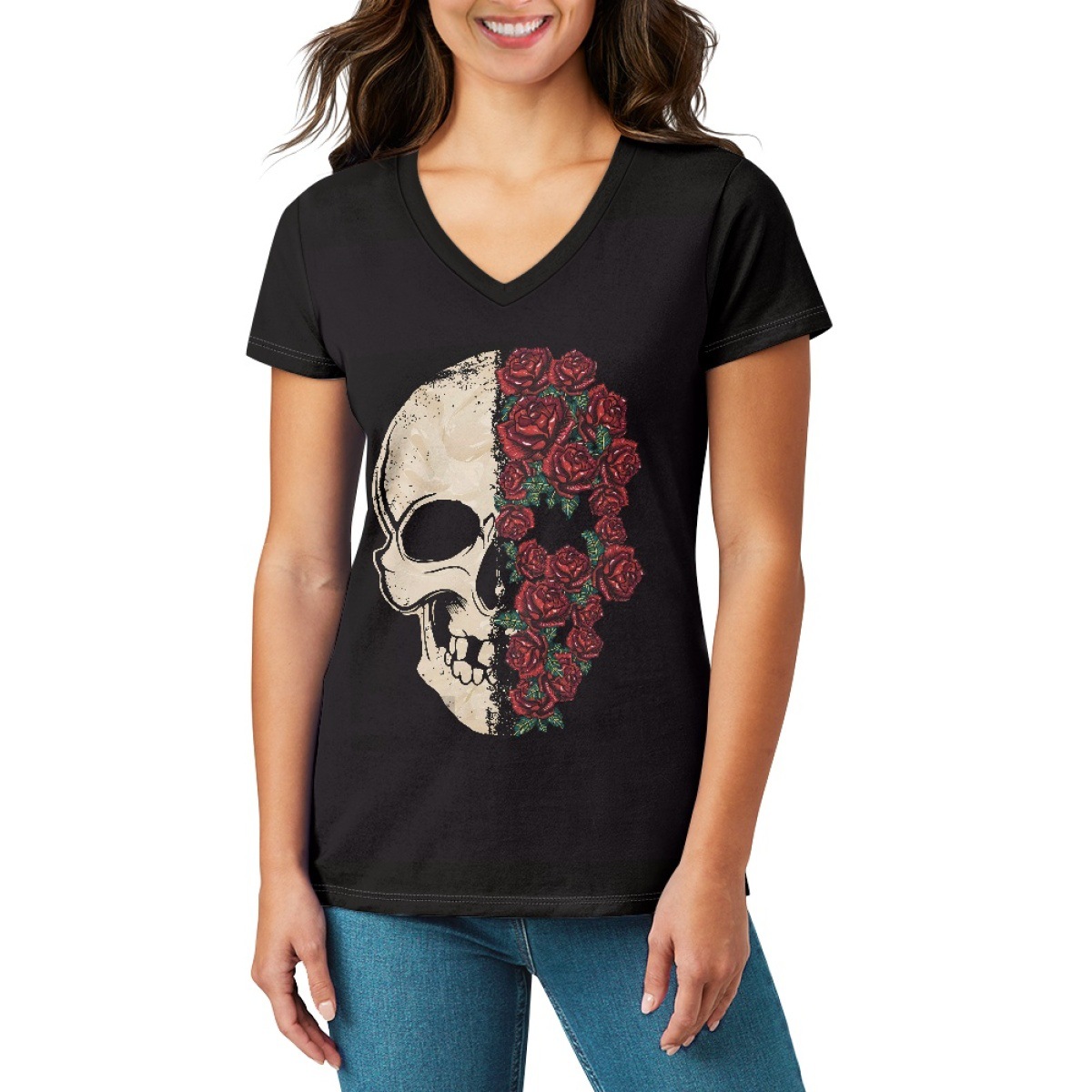 Amazon populer pola tengkorak mawar cetak gambar gaya ins wanita ukuran besar kaus V-neck
