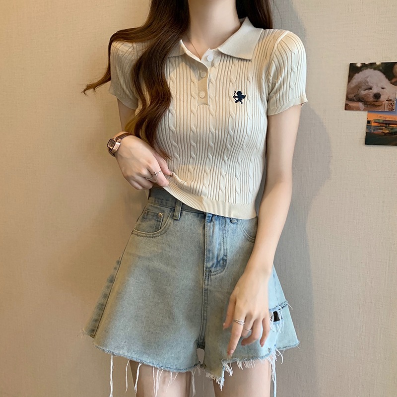 T-shirt Rajutan Lengan Pendek Warna Polos Membentuk Tubuh Kerah MPOLO Ukuran Besar Pakaian Wanita Atasan Model Pendek Manis dan Pedas Gaya Inggris Musim Panas