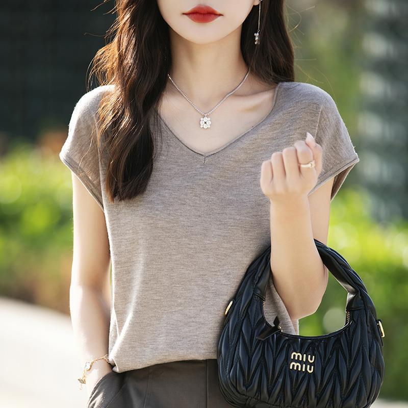 Kaus Sutra Murbei Model Baru Musim Panas 2025 Atasan Wanita Kemeja Rajutan Tipis Ringan Mengurangi Usia Gaya Barat Longgar Ukuran Besar Lengan Pendek Kerah V