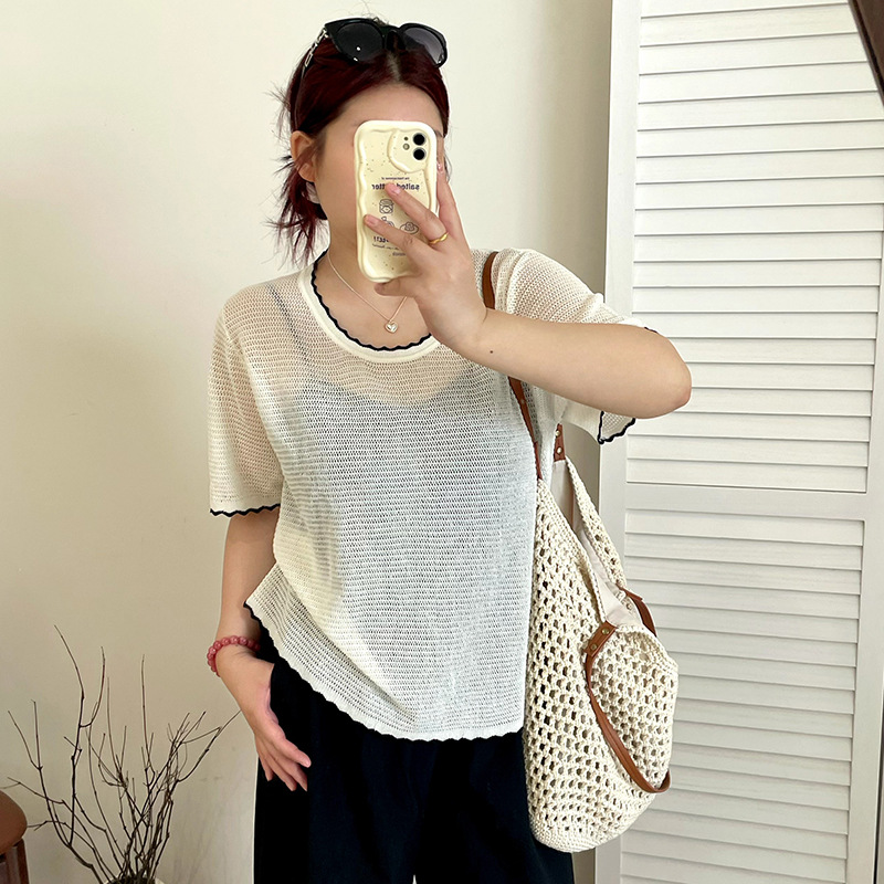 Pakaian Wanita Ukuran Besar Atasan Model Tipis Berongga Kerah Bulat Atasan Rajutan Wanita T-Shirt Lengan Pendek Longgar Gadis Gemuk Model Musim Panas 2025 23080