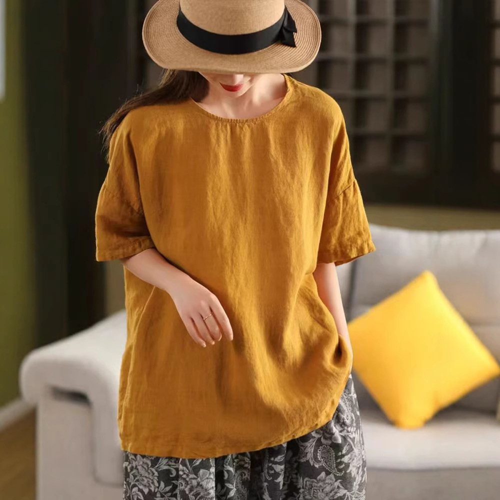 Pakaian Kopi Kuno Pakaian Atasan Linen Dicuci Retro Musim Panas Pakaian Wanita T-shirt Pullover Lengan Pendek Artistik Longgar Kerah Bulat Versi Besar