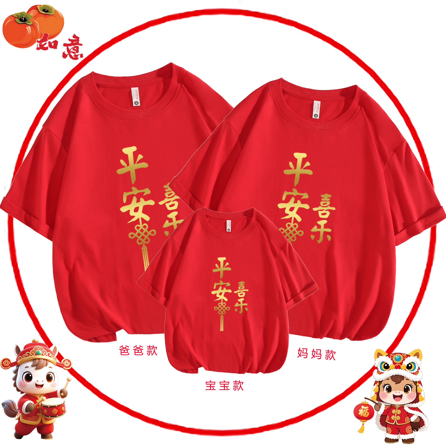 2026马年全家福酒红色亲子装短袖t恤一家三口四口家庭装平安喜乐