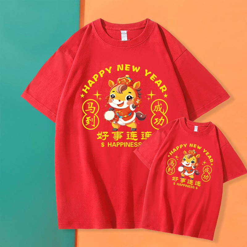 Tahun 2026 Tahun Kuda, keberuntungan datang ke keluarga saya, keluarga memakai kaos lengan pendek untuk Tahun Baru, kaos setengah lengan berleher bulat berwarna merah untuk pria dan wanita, cocok untuk keluarga beranggotakan tiga atau empat orang.