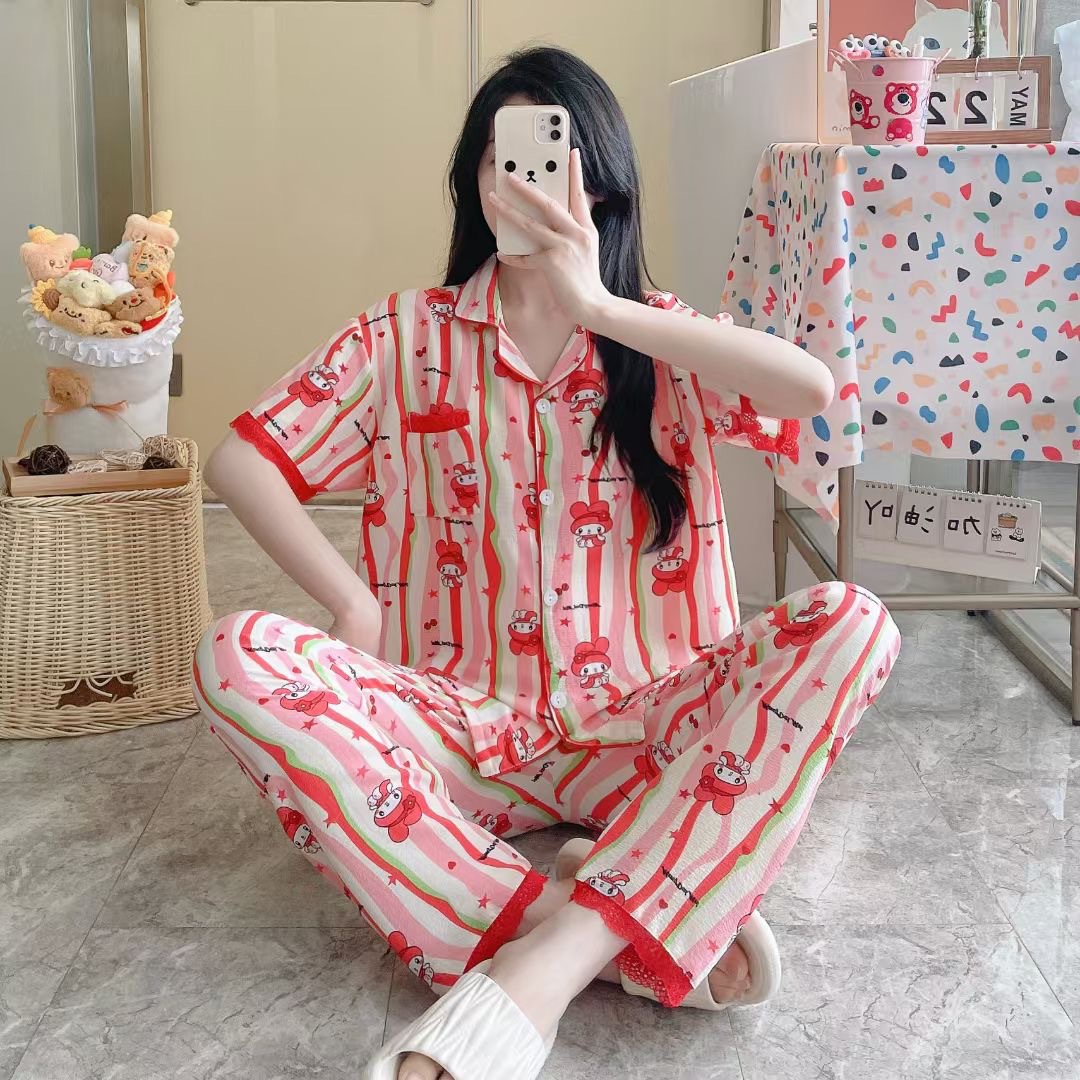 Piyama untuk Wanita Kardigan Musim Panas Lengan Pendek 2025 Pakaian Rumah Gaya Ins Kucing Kartun Musim Panas Baru Setelan Siswa