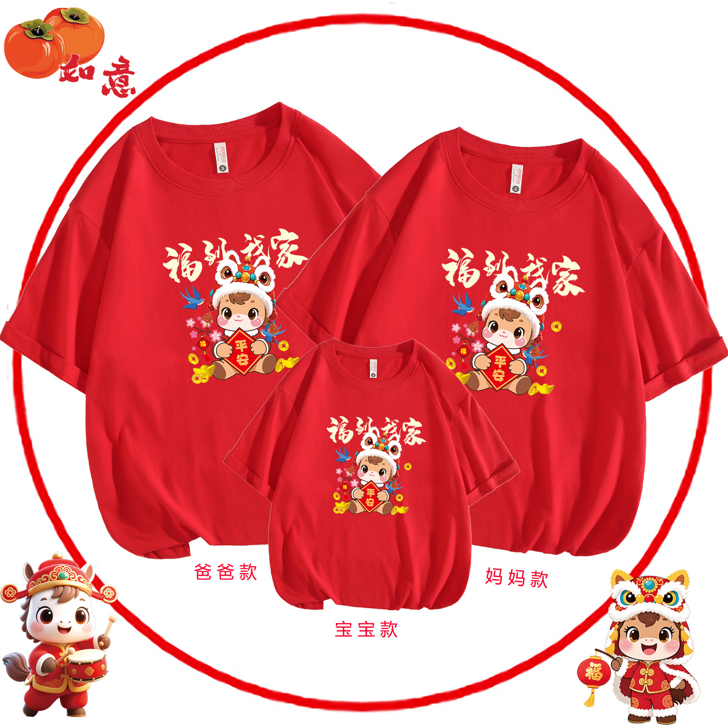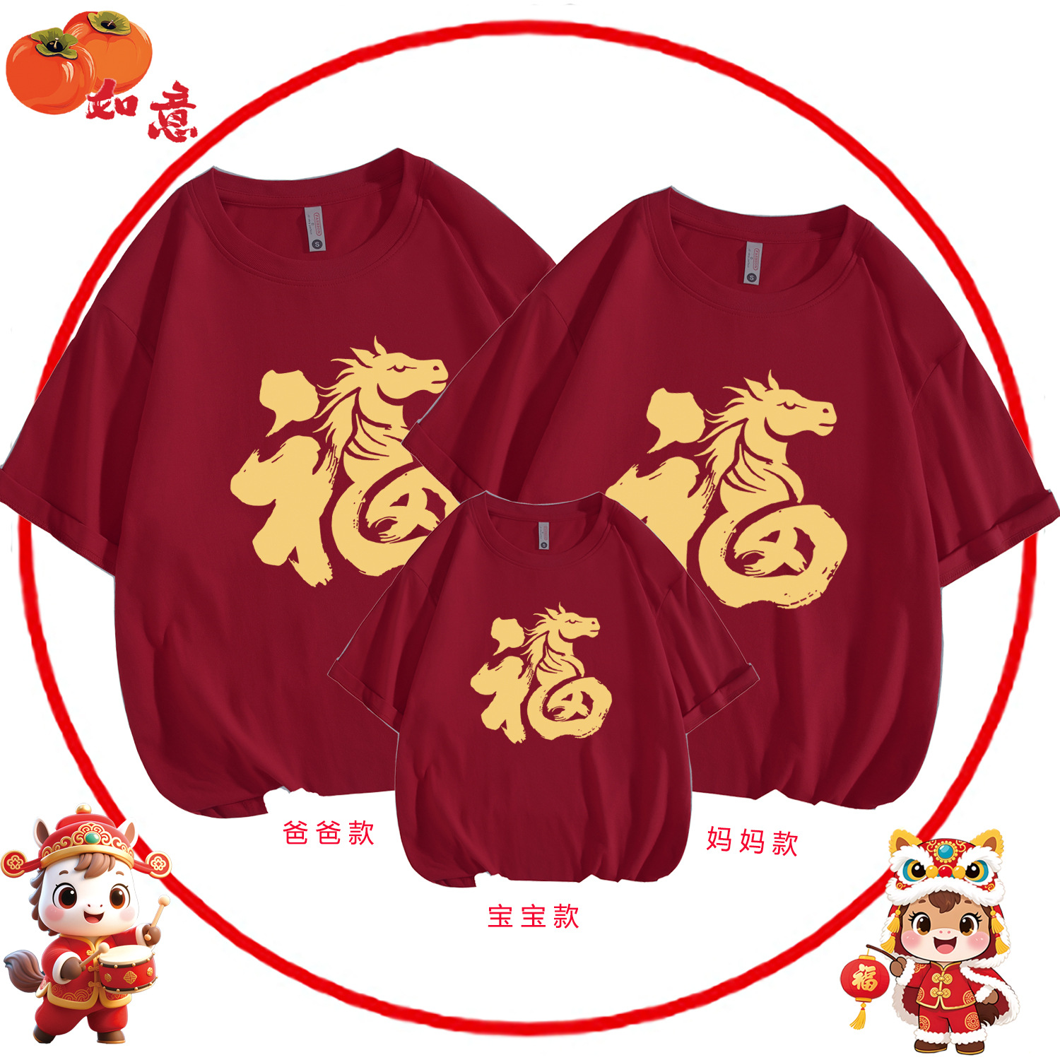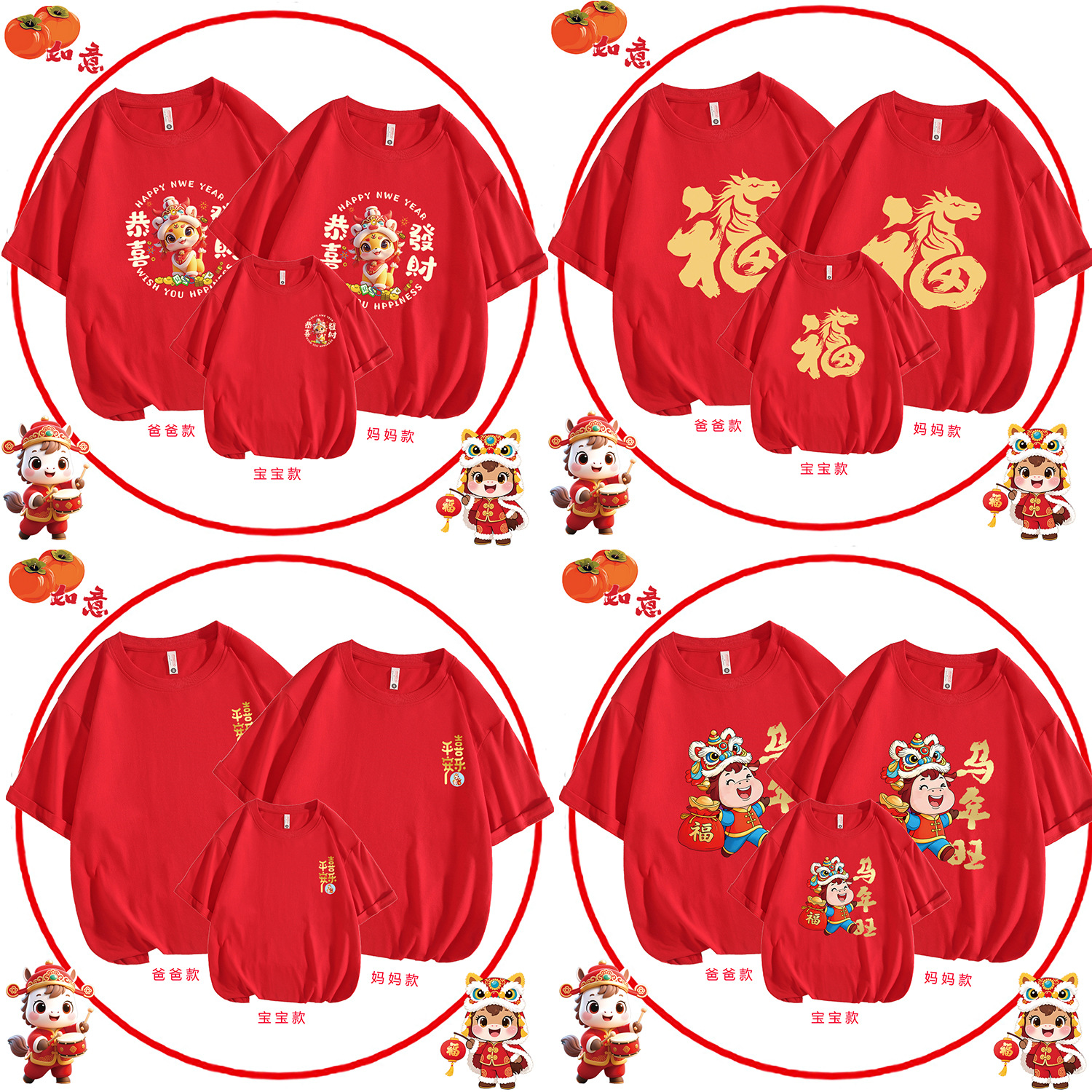 红色亲子装短袖t恤一家三口四口全家新年上衣2026马年本命年衣服