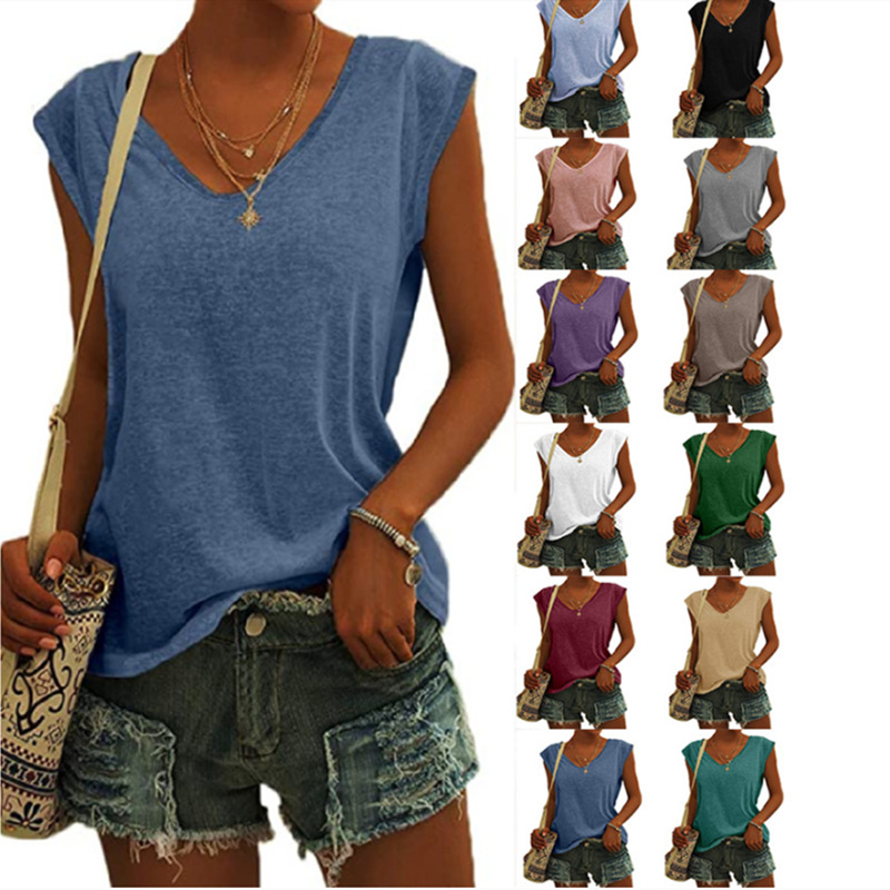 Kaus lengan pendek untuk wanita, rompi longgar kasual leher V lengan penutup warna polos Eropa dan Amerika musim panas 2021