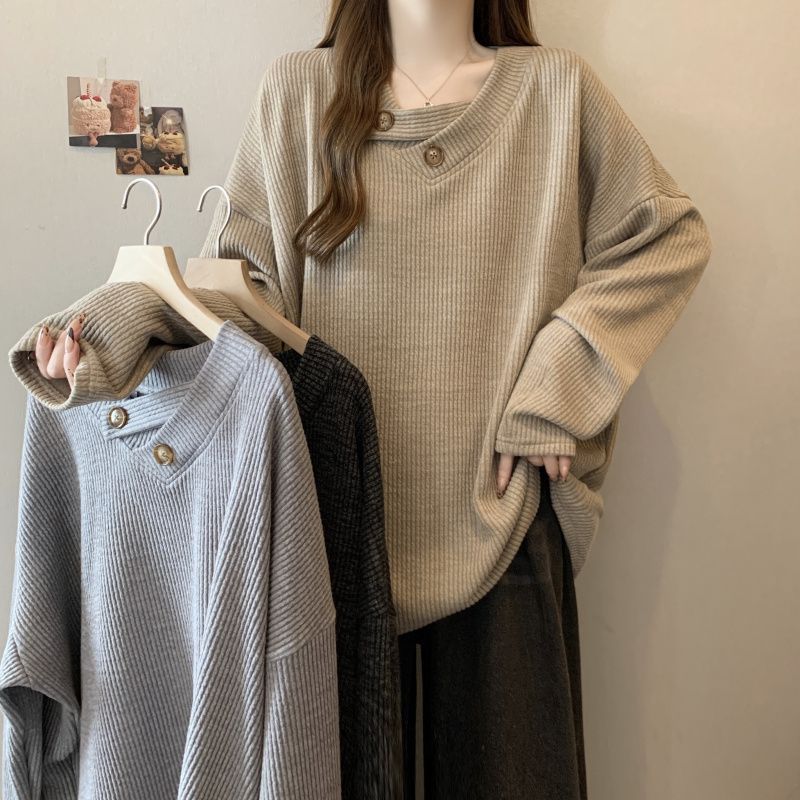 Atasan Lengan Panjang Kerah V Batang Berulir Ukuran Besar Wanita Kemeja Dalaman Modis Terlihat Langsing Longgar Model Baru Musim Gugur 2024 Wanita