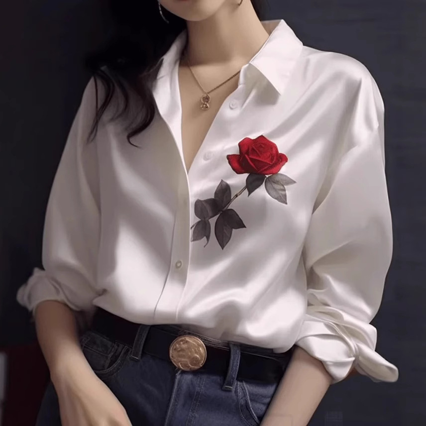 Kemeja Sutra Imitasi Permukaan Satin Asetat Bercorak Warna Putih Atasan Sosialita Mewah Ringan Kelas Tinggi Kemeja Sutra Es Lengan Panjang Chic