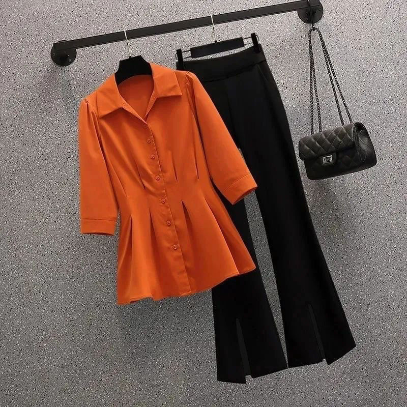 Setelan Daging Tersembunyi Menutupi Perut Wanita Gemuk Ukuran Besar Kemeja Lengan Pendek Tipe Panjang Sedang Bentuk Pir Terlihat Kurus Atasan Celana Kecil