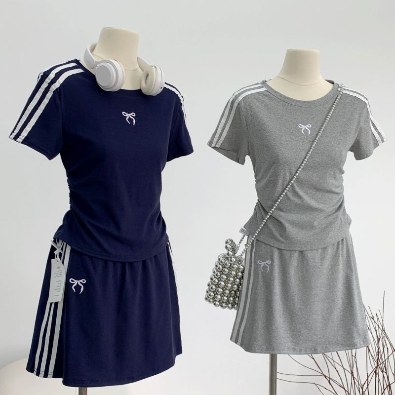 Setelan Olahraga Kasual Katun Murni Lintas Batas Wanita Kaos Lengan Pendek Pita Kupu-Kupu Tiga Bar Rok Setengah Badan Menutupi Pinggul Musim Panas Dua Set