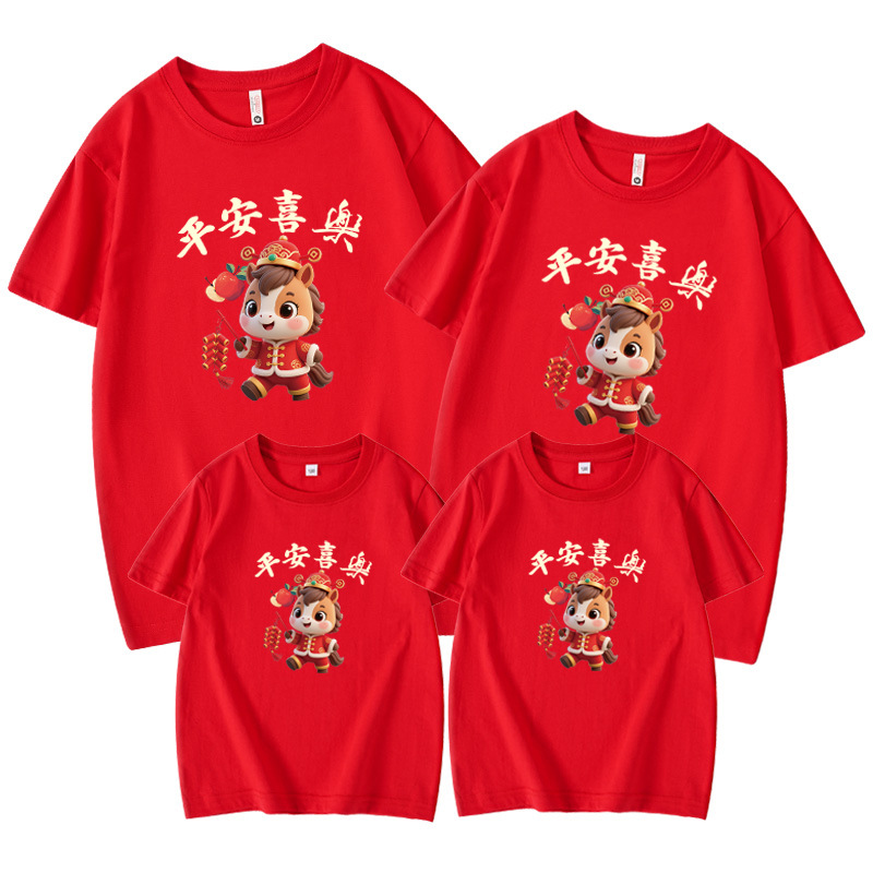 批发本命年马年短袖亲子装一家三四口家庭装红色生肖元旦活动衣服