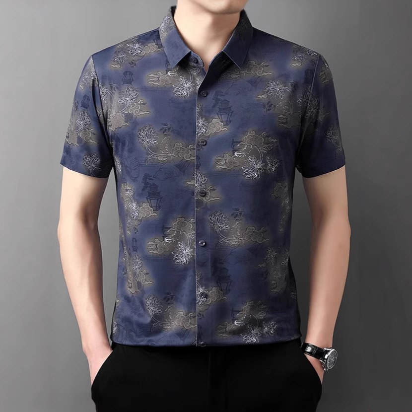 新款冰丝花衬男士短袖免烫无痕半袖夏季薄款透气爸爸商务休闲衬衣