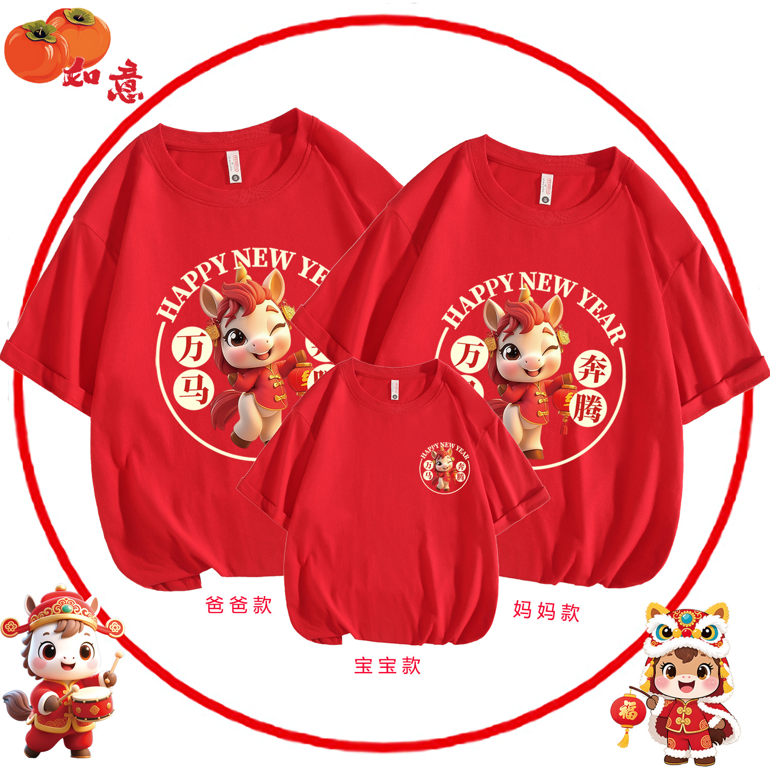 2026马年本命年t恤短袖亲子装红色 过年元旦活动男女儿童新年衣服