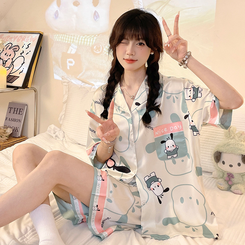 Pakaian Rumah Wanita Musim Panas Sutra Es Model Tipis Lucu Setelan Dua Potong Lengan Pendek Sutra Wanita Musim Panas