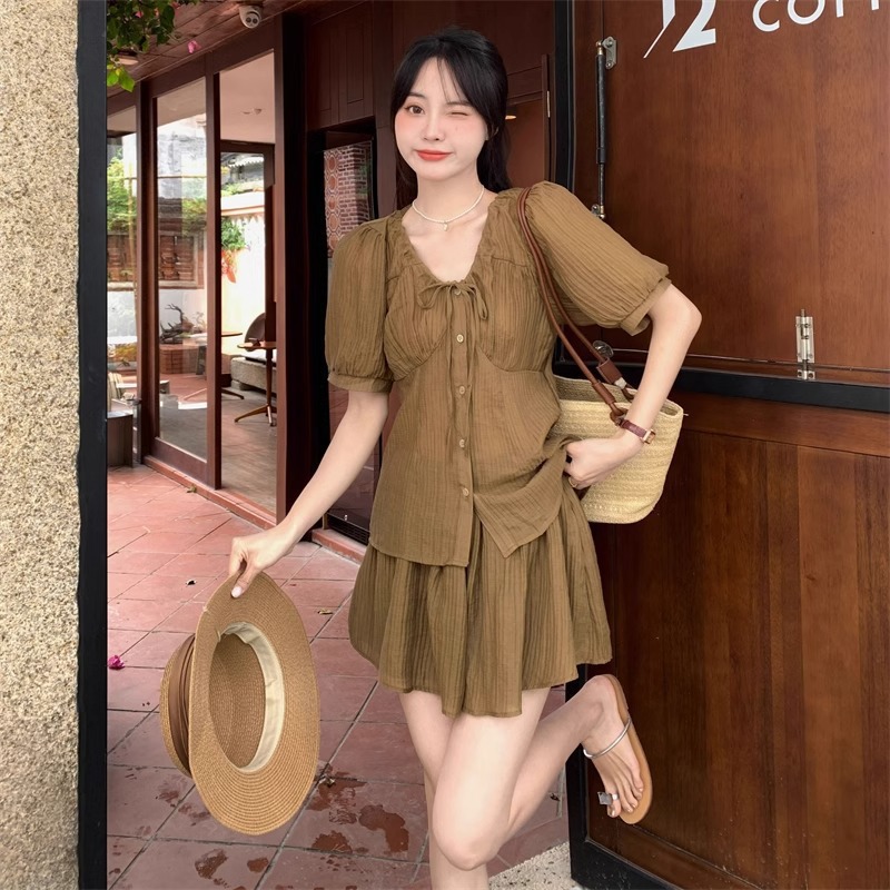 Pakaian Wanita Ukuran Besar Kemeja Musim Panas Lengan Pendek Atasan Celana Pendek Kaki Lebar Set Terlihat Kurus Wanita Gemuk Set Dua Potong Gaya Barat Mengurangi Usia Modis