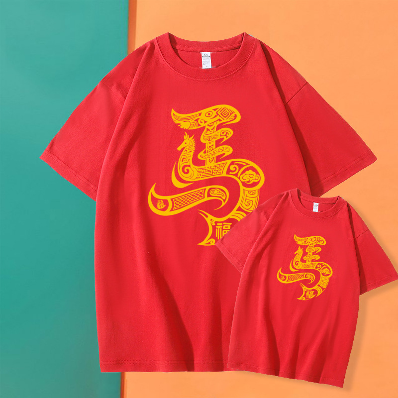 马年亲子装短袖红色喜庆一家三四口过年家庭装聚会活动母女装t恤