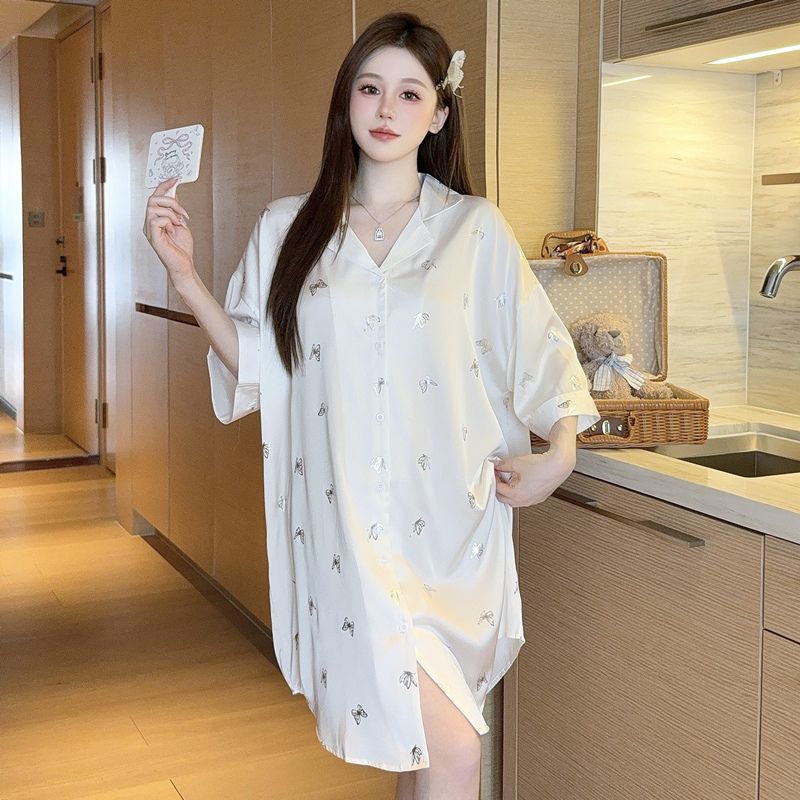 网红冰丝绸睡裙女春夏季薄款2024新款短袖高级感时尚宽松衬衫睡衣