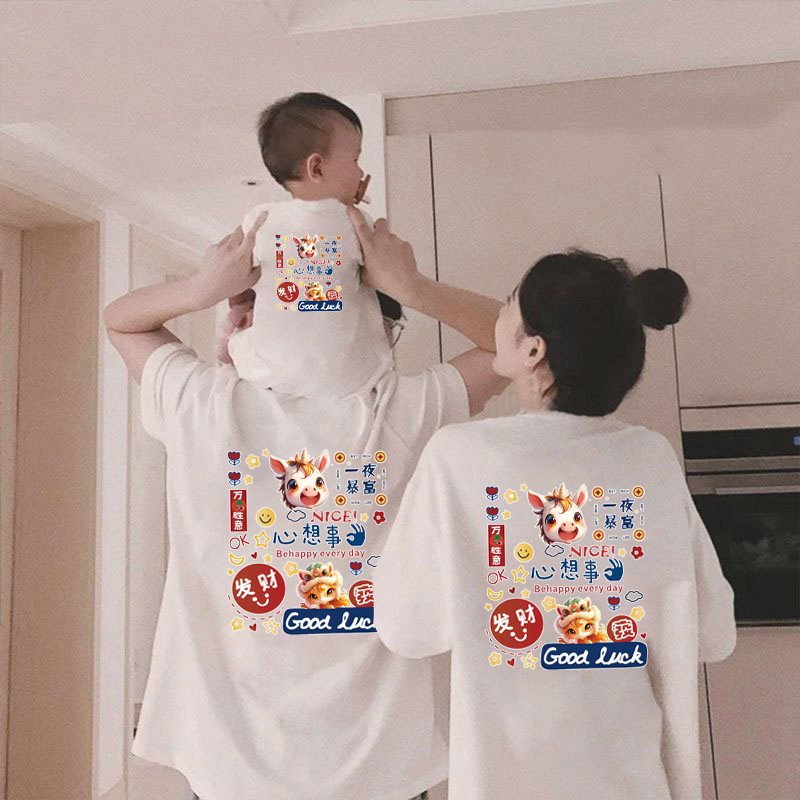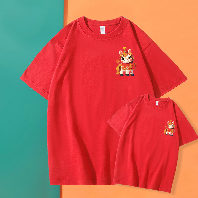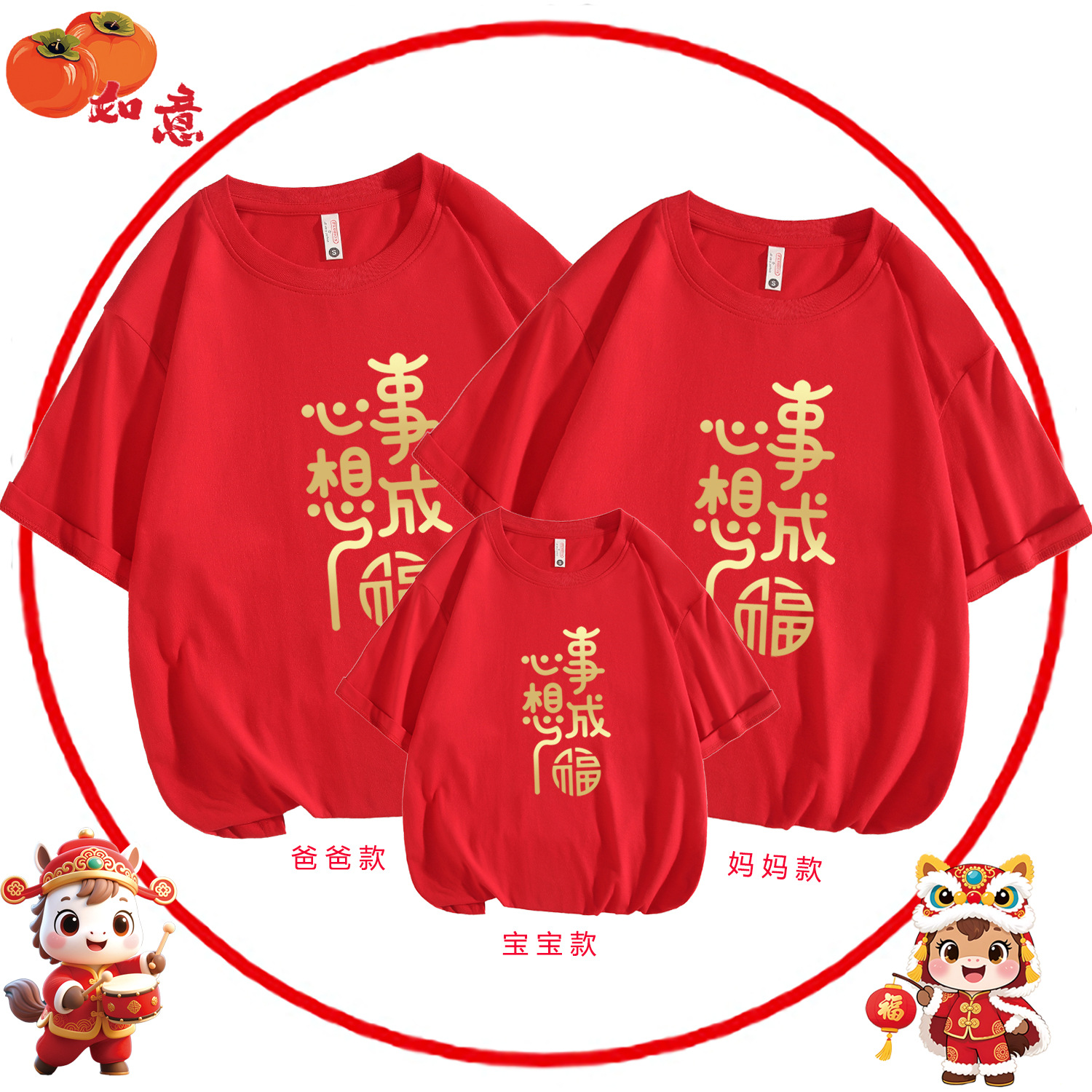 2026马年亲子装短袖一家三四口家庭装过年红色喜庆本命年聚会t恤
