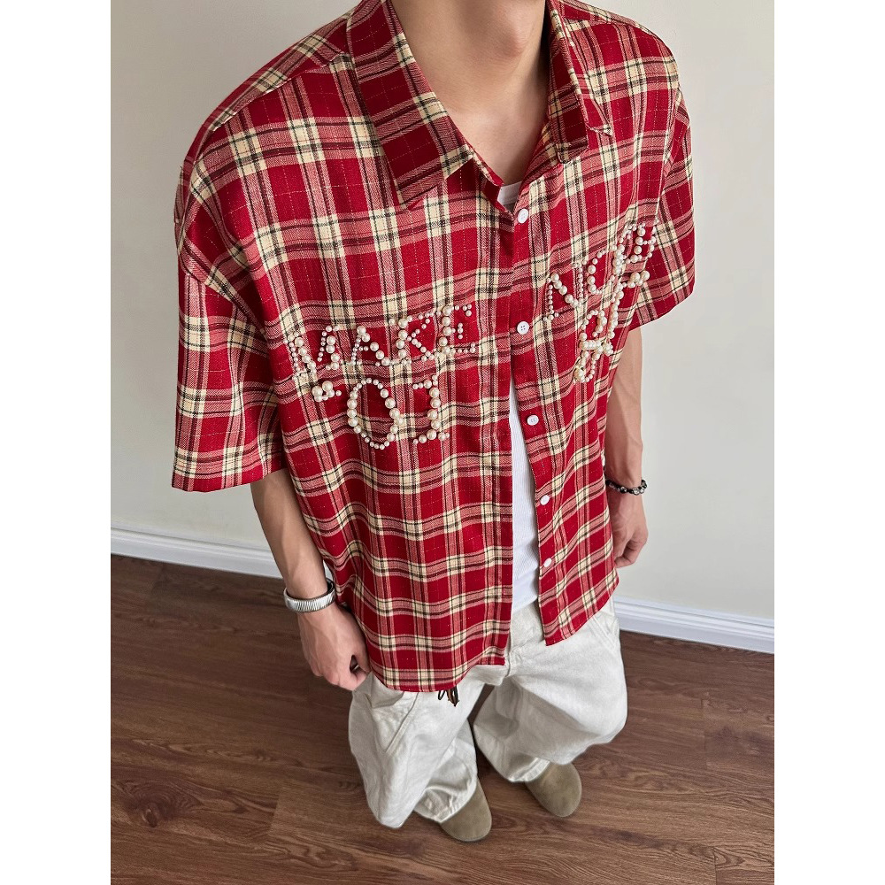Kemeja Lengan Pendek Kotak-kotak Manik-Manik Retro Kemeja Gaya Desain Niche Pasangan Longgar Model Baru Musim Panas Tahun 2025 Pria