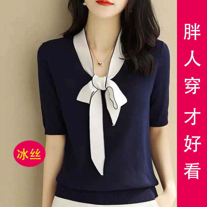Kaus lengan pendek wanita, 40.00 kg-100.00 kg ukuran besar es sutra wanita gemuk bersalin untuk wanita longgar perut longgar lengan pendek musim panas